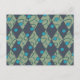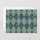 Harlequin diamond pattern background in purple-blue and eggshell. Bright blue circles with balls.