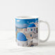 Beautiful photograph of the iconic blue church domes of Aghioi Theodoroi (Saints Theodore) that can be seen along the cliffside of Santorini Island, Greece.