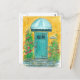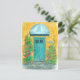 A pretty post card decorated with a watercolor painting of a bright turquoise blue door and mustard yellow cottage with red hollyhocks. Nice postcard for using as a "we've moved announcement to let friends, family, and clients know your new location.