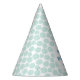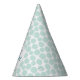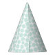 A custom birthday party hat featuring a large light blue dots pattern and text that you can edit to suit your occasion.