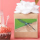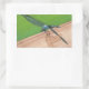 Painting of a blue dragonfly sitting on a wood rail, is printed on stickers. The rectangle stickers shows more of the wing spread.