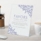 blue and white hand drawn growing leaf botanical art wedding favours please take one sign. Simple leaf design in blue and grey on white. Personalise with your own words, currently reads Favours Please take one. Thank you for celebrating with us the beginning of our 'Happily Ever After'. Ideal to use for guests to receive a favour on there way out in case you aren't still there to remind and gift to them personally. Other colours and matching items available. © Original leaf drawing and design by Sarah Trett for www.mylittleedenweddings.com on zazzle.