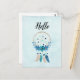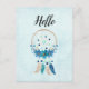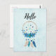 A hello postcard with a pretty watercolor dreamcatcher. Blue, turquoise and cream colours. Decorated with feathers, beads and flowers.