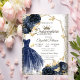 Gold glitter tiara, dress, butterflies, and blue roses on a navy blue background. Invite guests to join you in celebrating this milestone with a design that reflects the magic and joy of your quinceañera.