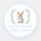 Cute blue Easter bunny rabbit with greenery whreath and spring flowers baby boy shower round stickers.