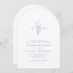 Minimalist blue and white arch wedding invitation, with your monogrammed initials and hand illustrated botanical leaves on the top, your event details are shown below in modern script and classic font. Simple and luxury. Great for modern classic wedding, simple formal wedding, elegant botanical garden wedding.