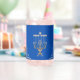 Enhance the presentation of beverages with a can glass design that features a blue background, an ornamental illustration, a menorah, and a monogram for a family name initial on the back. The design allows for convenience and ease of personalization with minimal effort required. This beer can glass is suitable for your table settings during the Hanukkah season this year. It can serve as a thoughtful gift for family and friends, a party favor for your guests, or even a stylish place setting on the table with the initials of each person sitting instead of a place card. This beautiful design will definitely make a lasting impression.