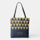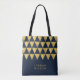 Elegant dark blue tote bag featuring chic faux gold triangle pattern that you can personalise with your name. Great as gifts for family and friends or for yourself.