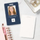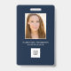 Navy blue employee photo identification badge with company logo. Replace the photo with your own and change the text. Easy to add the company logo. Modern, simple employee badge.