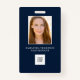 Navy blue employee photo identification badge with company logo. Replace the photo with your own and change the text. Easy to add the company logo. Modern, simple employee badge.