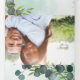 All in one botanical greenery wedding tri-fold invitation featuring a rustic faded watercolor washed out backdrop, elegant blue eucalyptus leaves, splashes of faux gold foil, your initials, the wedding details, invitation, and an rsvp postcard for your guests to cut off and send back.