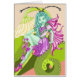 Beautiful blue fairy leaning against vibrant green plant set against a peach background and pale coloured flower. This captivating creature is dressed in pinks and purples and her dark blue curly hair contrasts against her blue skin. A gorgeous fantasy creature just lounging around in the neighbourhood.