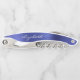 This distinctive personalised corkscrew features a modern blue brushed metal background. Customise it with a name in white cursive handwriting-style script.