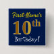This simple square button design features a message like "First-Name’s 10th Birthday!", with the "10th" having a faux/imitation gold-like colouring look, on a blue coloured background. The name can be personalised. Buttons like these could perhaps be worn by guests at a birthday party for somebody who is celebrating their tenth birthday, where the party is being held in a large area with lots of other people present (such as a city park or a theme park). [~Z0000164]