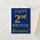 This simple, personalised birthday postcard design features the message "HAPPY 2nd BIRTHDAY", with the "2nd" having a faux gold-like appearance. The front also features a custom name, and a blue background. The back features a custom birthday greeting message, along with the customisable address of the birthday postcard recipient. It could be sent to somebody who is celebrating their second birthday. [~Z0000074]