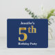 Blue, Faux Gold 5th Birthday Party + Custom Name Invitation