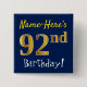 Blue, Faux Gold 92nd Birthday, With Custom Name 15 Cm Square Badge