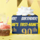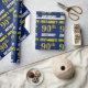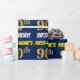 This wrapping paper design features a message like "FIRST-NAME’S 90th BIRTHDAY!", with the "90th" having a faux/imitation gold-like colour appearance, and with the name and "BIRTHDAY" in a fun, bold font. The name can be personalised, and the background is coloured blue. Wrapping paper like this could perhaps be used when wrapping birthday gifts being given to somebody in celebration of their ninetieth birthday. [~Z0000209]