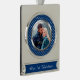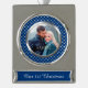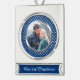 On this elegant Christmas ornament, your own photograph takes centre stage inside a shiny silver frame, which is placed on a bright blue background decorated with a silver heart pattern. Your custom text is in pale silver on a matching blue banner. Beautiful for a newlywed couple's 1st Christmas keepsake.