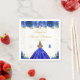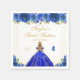 This elegant and glamourous sweet sixteen napkin features a beautiful princess with blonde hair and fair skin in a royal blue ball gown. The text combines handwritten script and modern sans serif fonts for a classy and sophisticated look. The floral arrangements, butterflies and gold confetti create the perfect blend of rustic and chic.