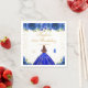 This elegant and glamourous birthday party napkin features a beautiful princess with brown red hair and fair skin in a royal blue ball gown. The text combines handwritten script and modern sans serif fonts for a classy and sophisticated look. The floral arrangements, butterflies and gold confetti create the perfect blend of rustic and chic.