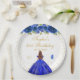 This elegant and glamourous birthday party plate features a beautiful princess with brown red hair and fair skin in a royal blue ball gown. The text combines handwritten script and modern sans serif fonts for a classy and sophisticated look. The floral arrangements, butterflies and gold confetti create the perfect blend of rustic and chic.