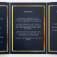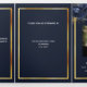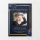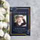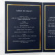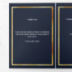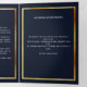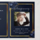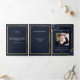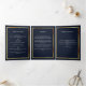 An elegant tri-fold program. A navy blue background, a faux gold frame, blue florals and space for a photo. Personalise and add name, dates and your text.