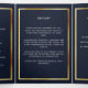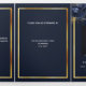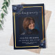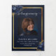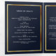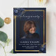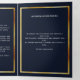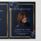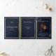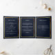 An elegant tri-fold program. A navy blue background, a faux gold frame, blue florals and space for a photo. Personalise and add name, dates and your text.