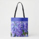 Fun floral tote bag with the cheer of spring blooms. Photograph of blue hyacinths in bloom on the bag, with a blue border. Pretty, feminine design. Lovely bag for those who adore blue and purple flowers. Available in choice of sizes.