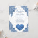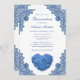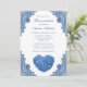 Beautiful blue floral quinceañera party invitation featuring a blue hydrangea heart and floral lace.