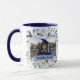 This photo graduation mug features blue and white watercolor florals on the front and Class of 2021 in a faux gold glitter on the back. The front has a place to personalise with a name over a watercolor swash. There is a faux gold confetti accent near the name.