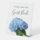 Wedding sign for the signing of the guest book. Light blue hydrangea flowers design on white plastic standing sign. Black text in two places asks guests to “please sign our guest book”. Choose your preferred sign size. This pretty flower is part of the Blue Heaven design line. See matching items in the collection.