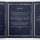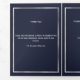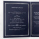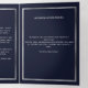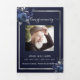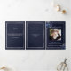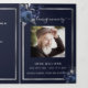 An elegant tri-fold program. A navy blue background, a faux silver frame, blue florals and space for a photo. Personalise and add name, dates and your text.