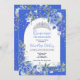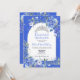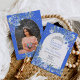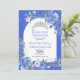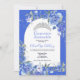 A pretty and elegant chic modern twist to the traditional Quinceañera on royal blue backound with a silver glitter princess tiara crown, featuring a hand painted pretty floral and botanical blue wreath bouquet and sky blue blooms with silver grey glitter confetti and a modern glitter arch shape, with an elegant script typography Quinceañera birthday. Add your photo at the back. perfect Mis Quince birthday party with a rose gold princess tiara crown.