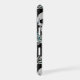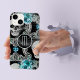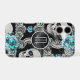 Grey skulls and teal blue flowers are the feature on this phone case. At the centre is a round banner lined in matching silver, with your monogram also in silver. A curl of silver stardust is laid over the top half of the design. Unique!