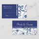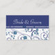 Wedding table place setting cards in elegant blue and white floral swirl pattern, also available in matching cards, invitations, magnets, stickers, and stamps.