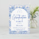 An elegant graduation celebration design featuring a delicate blue toile floral border inspired by classic European porcelain and vintage botanical prints. The intricate florals frame a clean arched center panel, creating a refined and timeless composition that highlights the graduate’s name and event details beautifully. Soft blue tones against a crisp ivory background give the design a sophisticated yet celebratory feel. Perfect for a stylish graduation gathering with a classic, romantic aesthetic.