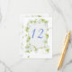 Pretty wedding reception table number card done in white, with graphics of a light green framed white text area, with vines and blue flowers decorating it. Personalise the blue number for each table at your reception. Matching wedding products are available.