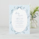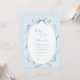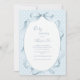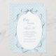 Beautiful blue watercolor ribbon frame surrounding lovely fonts and scripts done in coordinating colors baby shower invite. A blue and white sweet coordinated polka dot background. A perfect baby shower invitation for any season.