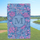 This customisable ladies golf towel features a pink and blue pattern adapted from a William Morris design, with a personalizable monogram. It's a stylish accessory that would be a good gift for any woman who plays golf.