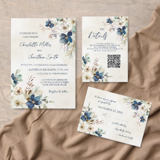 Elegant and modern customizable return address labels for your winter wedding with delicate watercolor flowers in shades of dark blue and cream. Customize this template to create a unique address label for your wedding.