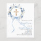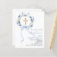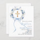 An elegant white background, decorated with watercolored blue flowers in a wreath, a blue bow and a golden cross. Personalise and add a name and details.