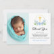 Blue florals and gold cross boy baptism photo Thank you card. Express your heartfelt gratitude with this exquisite baptism thank you card. The design features a beautiful arrangement of soft blue flowers that gently embrace a gold circle. A delicate gold cross, a symbol of faith, love, and new beginnings, is nestled within the gold circle. To personalise this card and make it even more special, a cherished photograph of your precious baby boy can be displayed to the left of this elegant design. Beyond the visual beauty, you have the opportunity to further customise the text, wording, and overall design, allowing you to craft a truly unique and deeply sentimental keepsake to express your sincere appreciation for those who shared in this blessed occasion.