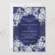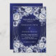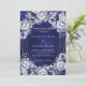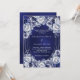For a winter wedding. A navy blue, uneven coloured background decorated with blue and white flowers. A faux silver oval frame. Personalise and add your names and details.