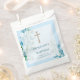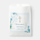 Beautiful baptism favour bags, featuring a gold crucifix and pretty watercolour blue hyacinth design. Ready for easy personalisation.