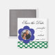 This fun and modern design is a perfect Save the Date magnet reminder. The background is white with a blue flower as a frame for your photo. There is a green lattice fence graphic at the bottom. The text is completely customizeable.