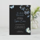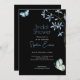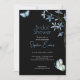 The focal points of this invitation are the dainty blue flowers and playful blue and green butterflies, delicately scattered across the design. The delicate blue flowers symbolise grace, admiration, and new beginnings, while the whimsical butterflies represent transformation, joy, and the beauty of life's fleeting moments. Against the sleek black canvas, these elements create a captivating contrast, making the design both enchanting and visually striking.