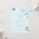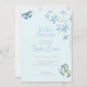 The enchanting design is adorned with dainty blue flowers and playful blue and green butterflies, delicately scattered across the invitation. The delicate blue flowers symbolise grace, admiration, and new beginnings, while the whimsical butterflies represent transformation, joy, and the beauty of fleeting moments. Set against the light blue canvas, these elements create a harmonious and captivating visual experience.