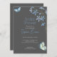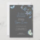 The focal points of this invitation are the delicate blue flowers and playful blue and green butterflies, artfully arranged against the dark grey canvas. The dainty blue flowers symbolise grace, admiration, and new beginnings, while the whimsical butterflies represent transformation, joy, and the beauty of life's fleeting moments. Against the muted grey backdrop, these elements create a striking contrast, making the design both captivating and enchanting.