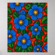 Blue Flowers and Green Leaves on a Red Background Poster